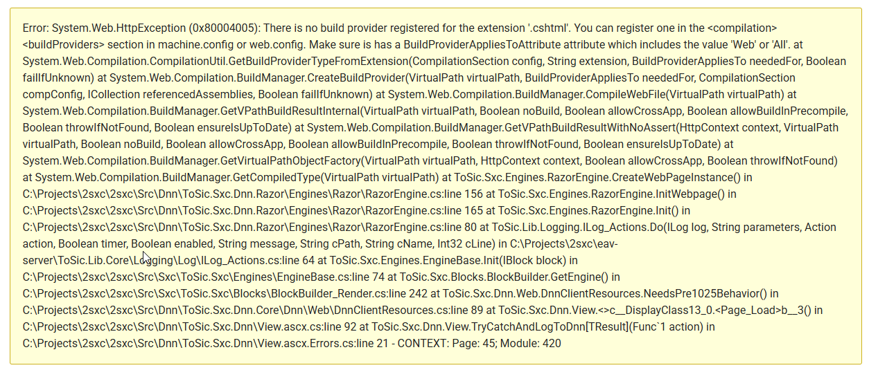 Error: System.Web.HttpException (0x80004005): There is no build provider registered for the extension '.cshtml'. You can register one in the <compilation><buildProviders> section in machine.config or web.config. Make sure is has a BuildProviderAppliesToAttribute attribute which includes the value 'Web' or 'All'. at System.Web.Compilation.CompilationUtil.GetBuildProviderTypeFromExtension(CompilationSection config, String extension, BuildProviderAppliesTo neededFor, Boolean failIfUnknown) at System.Web.Compilation.BuildManager.CreateBuildProvider(VirtualPath virtualPath, BuildProviderAppliesTo neededFor, CompilationSection compConfig, ICollection referencedAssemblies, Boolean failIfUnknown) at System.Web.Compilation.BuildManager.CompileWebFile(VirtualPath virtualPath) at System.Web.Compilation.BuildManager.GetVPathBuildResultInternal(VirtualPath virtualPath, Boolean noBuild, Boolean allowCrossApp, Boolean allowBuildInPrecompile, Boolean throwIfNotFound, Boolean ensureIsUpToDate) at System.Web.Compilation.BuildManager.GetVPathBuildResultWithNoAssert(HttpContext context, VirtualPath virtualPath, Boolean noBuild, Boolean allowCrossApp, Boolean allowBuildInPrecompile, Boolean throwIfNotFound, Boolean ensureIsUpToDate) at System.Web.Compilation.BuildManager.GetVirtualPathObjectFactory(VirtualPath virtualPath, HttpContext context, Boolean allowCrossApp, Boolean throwIfNotFound) at System.Web.Compilation.BuildManager.GetCompiledType(VirtualPath virtualPath) at ToSic.Sxc.Engines.RazorEngine.CreateWebPageInstance() in C:\Projects\2sxc\2sxc\Src\Dnn\ToSic.Sxc.Dnn.Razor\Engines\Razor\RazorEngine.cs:line 156 at ToSic.Sxc.Engines.RazorEngine.InitWebpage() in C:\Projects\2sxc\2sxc\Src\Dnn\ToSic.Sxc.Dnn.Razor\Engines\Razor\RazorEngine.cs:line 165 at ToSic.Sxc.Engines.RazorEngine.Init() in C:\Projects\2sxc\2sxc\Src\Dnn\ToSic.Sxc.Dnn.Razor\Engines\Razor\RazorEngine.cs:line 80 at ToSic.Lib.Logging.ILog_Actions.Do(ILog log, String parameters, Action action, Boolean timer, Boolean enabled, String message, String cPath, String cName, Int32 cLine) in C:\Projects\2sxc\eav-server\ToSic.Lib.Core\Logging\Log\ILog_Actions.cs:line 64 at ToSic.Sxc.Engines.EngineBase.Init(IBlock block) in C:\Projects\2sxc\2sxc\Src\Sxc\ToSic.Sxc\Engines\EngineBase.cs:line 74 at ToSic.Sxc.Blocks.BlockBuilder.GetEngine() in C:\Projects\2sxc\2sxc\Src\Sxc\ToSic.Sxc\Blocks\BlockBuilder_Render.cs:line 242 at ToSic.Sxc.Dnn.Web.DnnClientResources.NeedsPre1025Behavior() in C:\Projects\2sxc\2sxc\Src\Dnn\ToSic.Sxc.Dnn.Core\Dnn\Web\DnnClientResources.cs:line 89 at ToSic.Sxc.Dnn.View.<>c__DisplayClass13_0.<Page_Load>b__3() in C:\Projects\2sxc\2sxc\Src\Dnn\ToSic.Sxc.Dnn\View.ascx.cs:line 92 at ToSic.Sxc.Dnn.View.TryCatchAndLogToDnn[TResult](Func`1 action) in C:\Projects\2sxc\2sxc\Src\Dnn\ToSic.Sxc.Dnn\View.ascx.Errors.cs:line 21 - CONTEXT: Page: 45; Module: 420